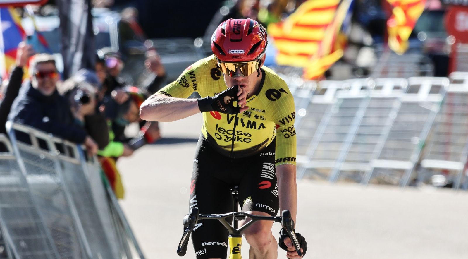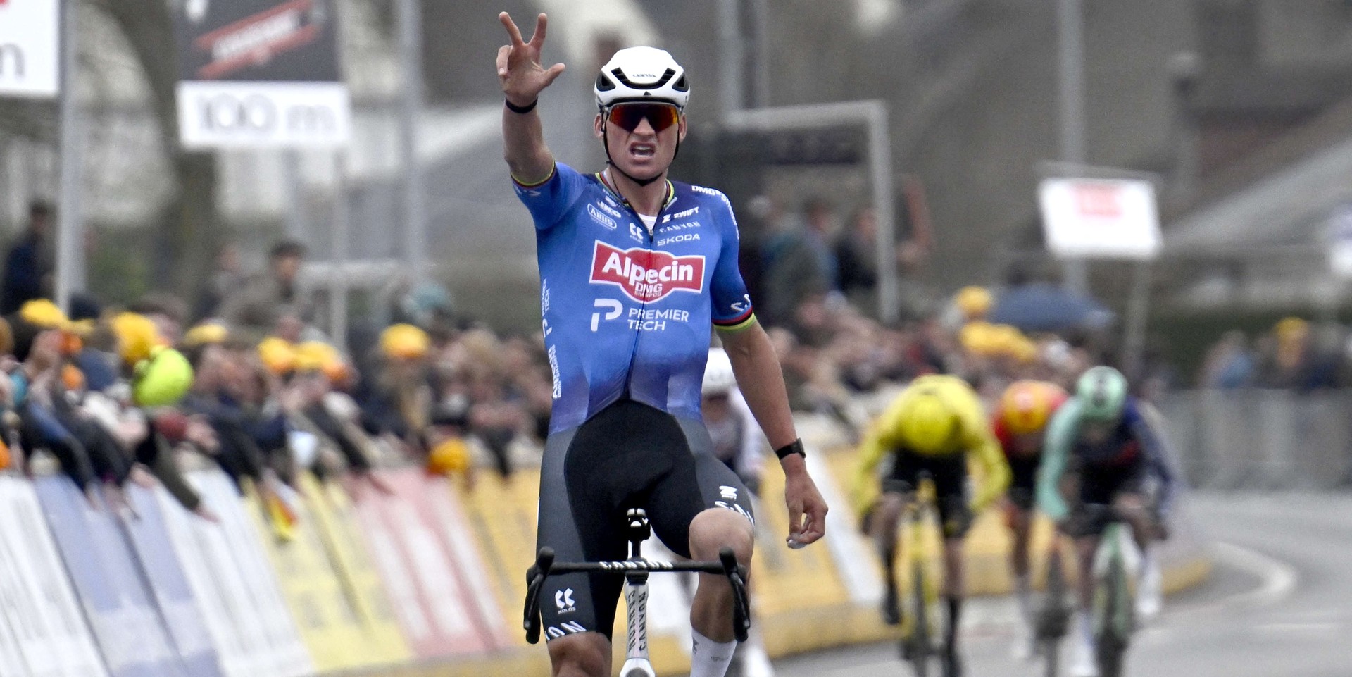 Evenepoel s Vingegaardem odjeli na větru celému balíku. Jenže necelý kilometr před cílem šel Evenepoel k zemi. Podruhé vyhrál Godon