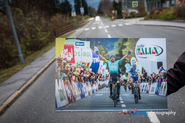 Poprvé nám pořadatelé ukázali kousek tratě MS vloni na jaře. Etapu Tour of the Alps zde vyhrál Michele Scarponi, tato fotografie od Josefa Vaishara visí Thomasi Rohreggerovi, jednomu z pořadatelů, v kanceláři.
