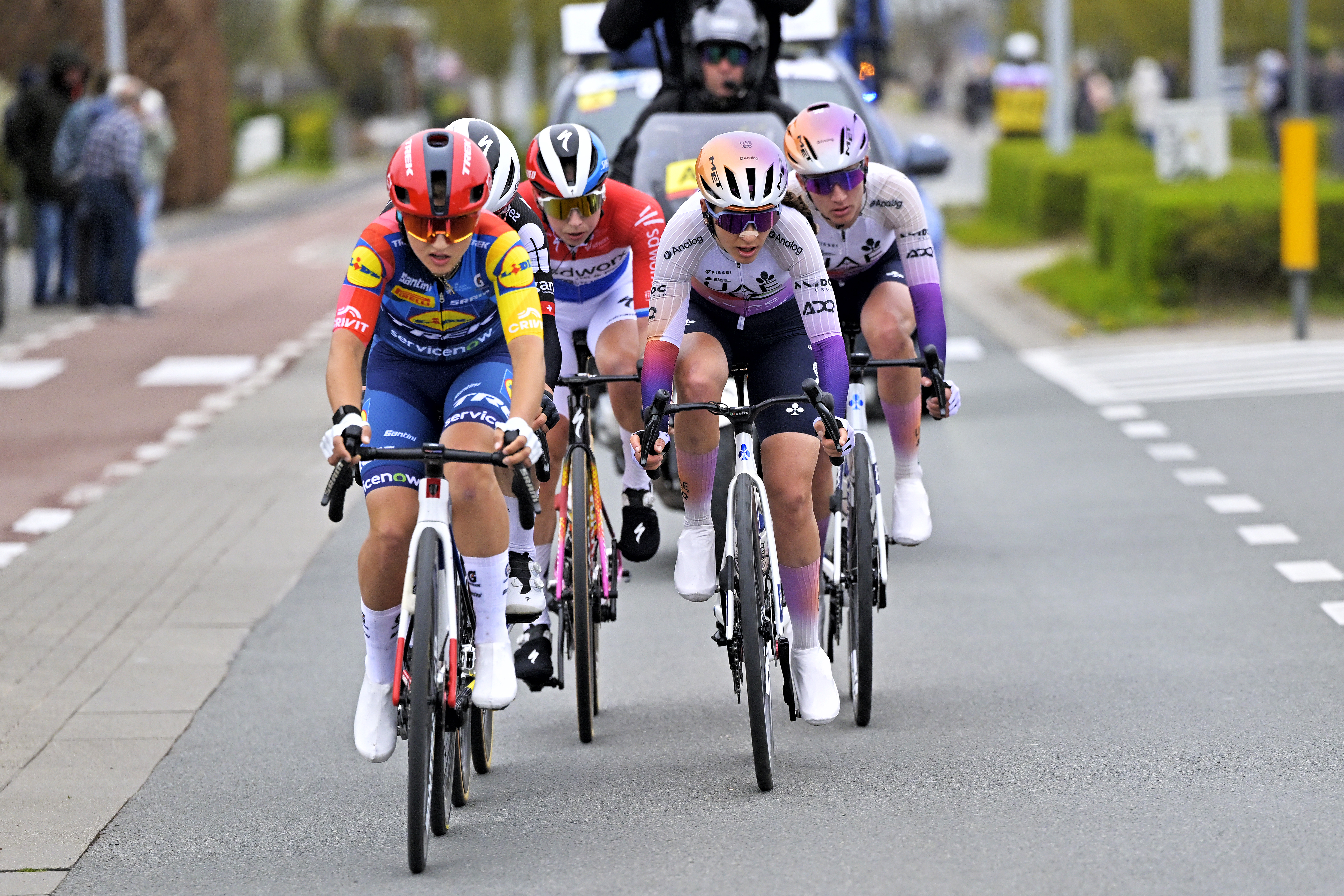 Na čele závodu se vytvořila skupina pěti závodnic ve složení Wiebes, Moors, Swinkels, Gasparrini a Chabbey.K nim se snažila dotáhnout skupina s dalšími favoritkami – například Elisou Balsamo, Charlotte Kool či závodnicemi týmu AG Insurance–Soudal – ale náskok lídryň už nedokázala stáhnout.
